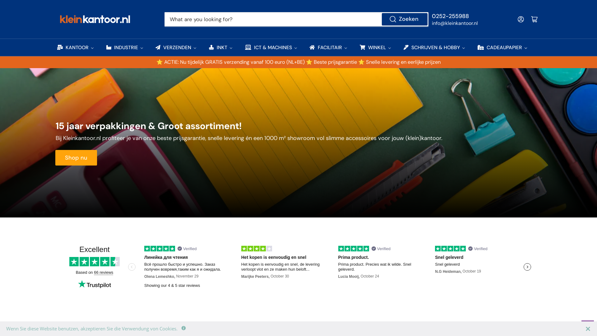 Kleinkantoor.nl is a professional store & wholesaler for packaging and office supplies located in Noordwijkerhout. With a wide range and the option to purchase items in small quantities, we offer flexibility and choice for our customers. Our store and warehouse capacity of 500m2 makes it possible to offer a wide range, including sustainable disposables and environmentally friendly packaging. We also offer the option to print boxes and shipping packaging with your own name or logo.