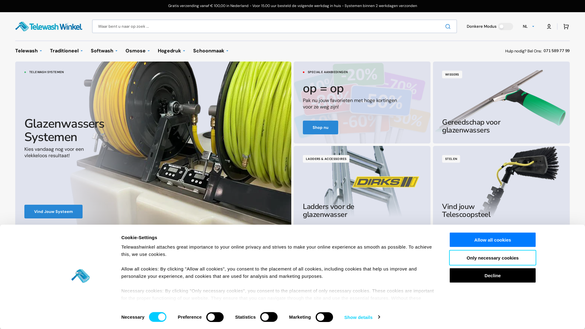 With an extensive range of more than 2500 products, Telewashwinkel® can offer a solution for almost every challenge of high-altitude cleaning. Simply put, this means that you work with people who are committed to an efficient and professional approach to your business. Telewashwinkel has an extensive range that meets the needs for the 'new era glass and facade cleaning', from simple starter kits to complete installations in commercial vehicles and 'plug and play' packages.
