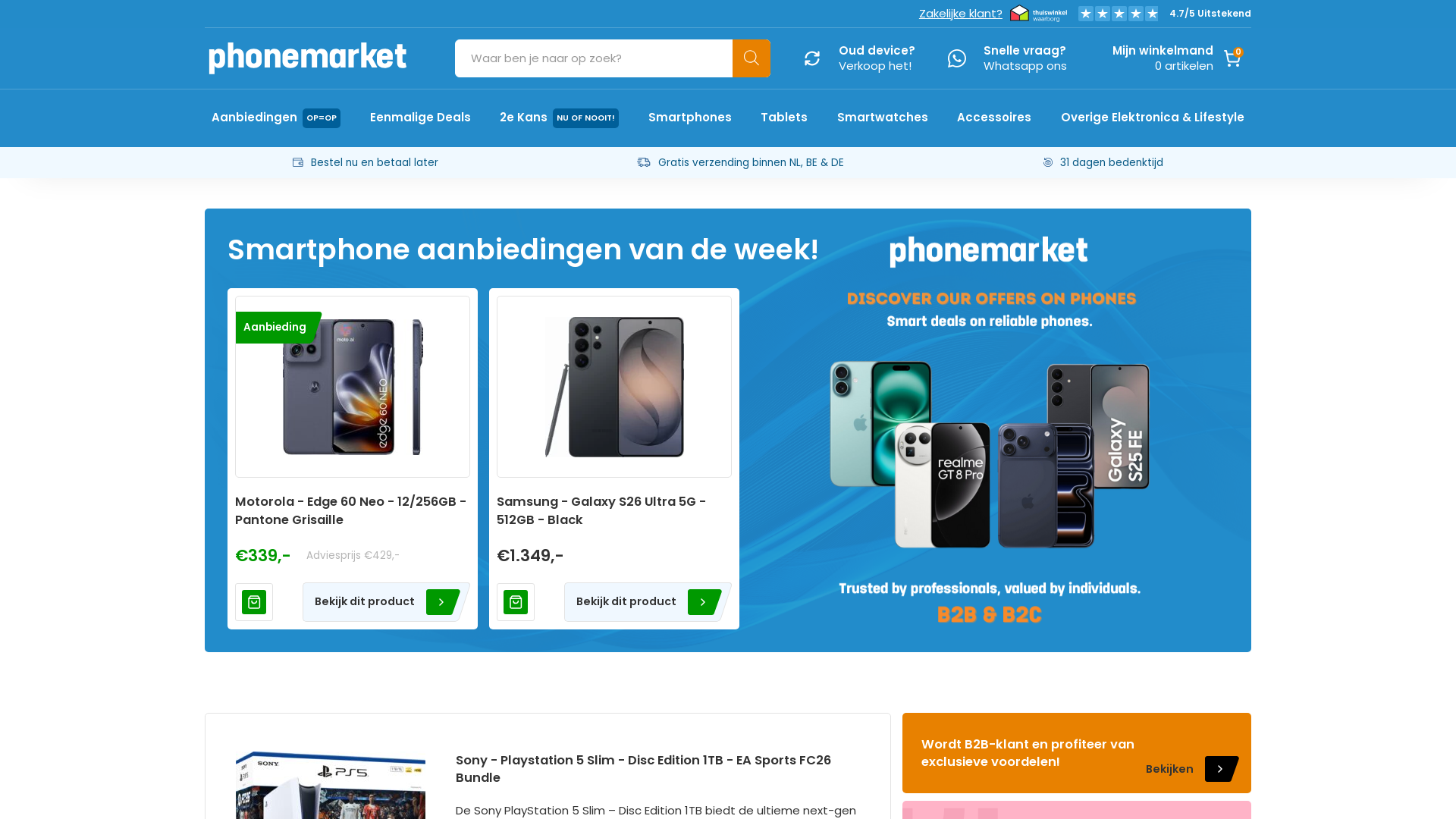 Scoor de nieuwste smartphones en tablets voor de allerlaagste prijs bij Phonemarket.nl. Wij bieden een breed assortiment topmerken zoals Apple, Samsung en Xiaomi, altijd simlockvrij en direct uit voorraad leverbaar. Profiteer van onze scherpe aanbiedingen en razendsnelle levering, zodat je direct kunt genieten van de nieuwste technologie. Kies slim voor je portemonnee zonder in te leveren op kwaliteit bij Phonemarket.nl!